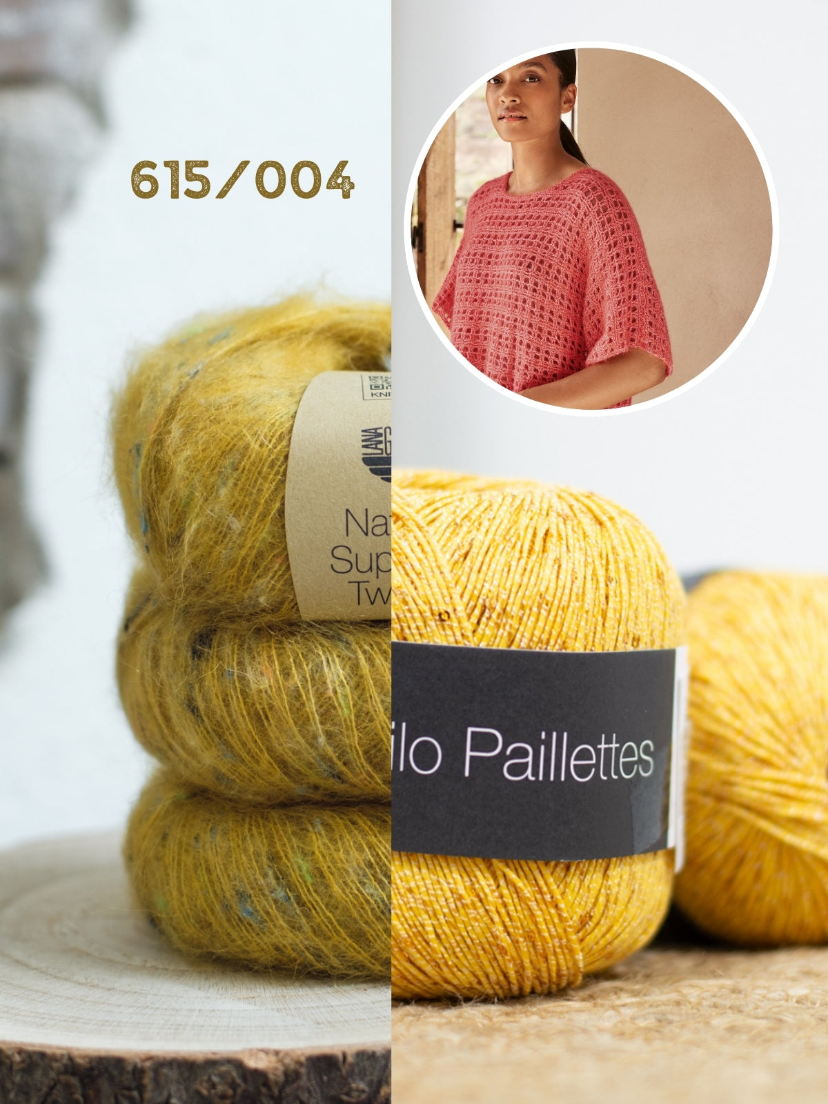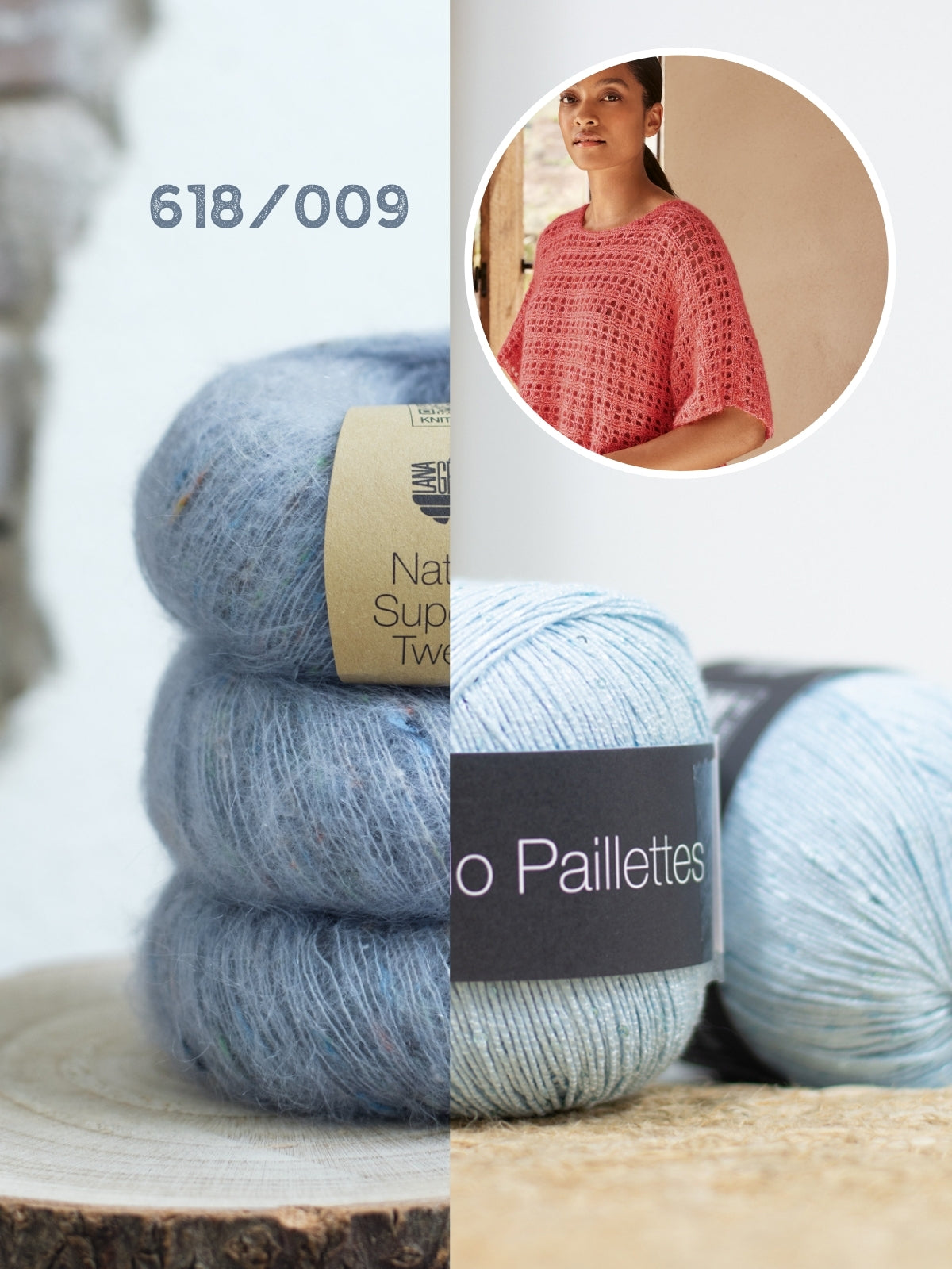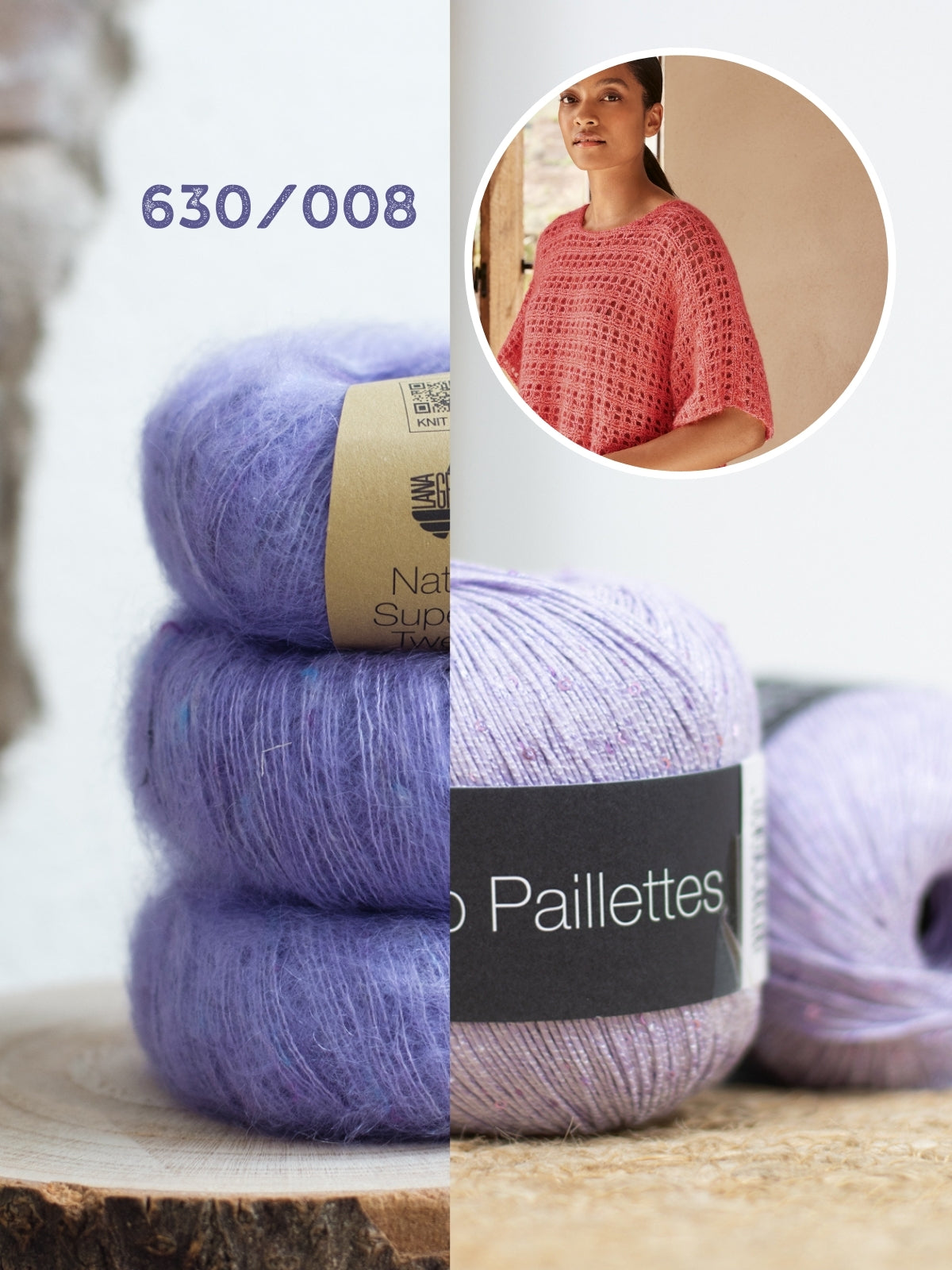 Het pakket bestaat uit 8/9/10/10 bollen Filo Paillettes, 7/8/8/9 bollen Natural Superkid Tweed en het Filati Journal 71 magazine van Lana Grossa. De benodigde naalden (haaknaald 4.5mm) kun je hieronder toevoegen aan je winkelmandje.