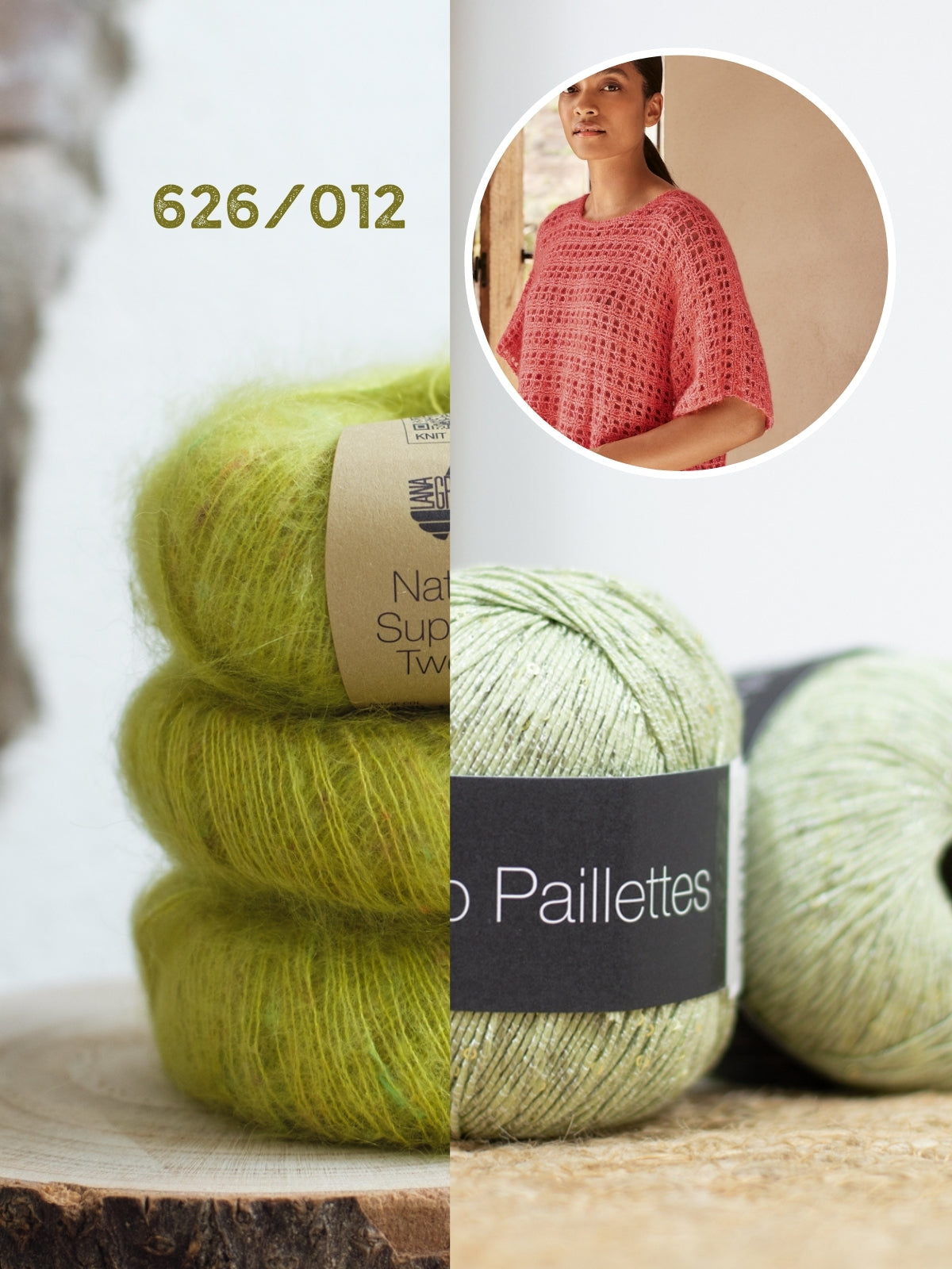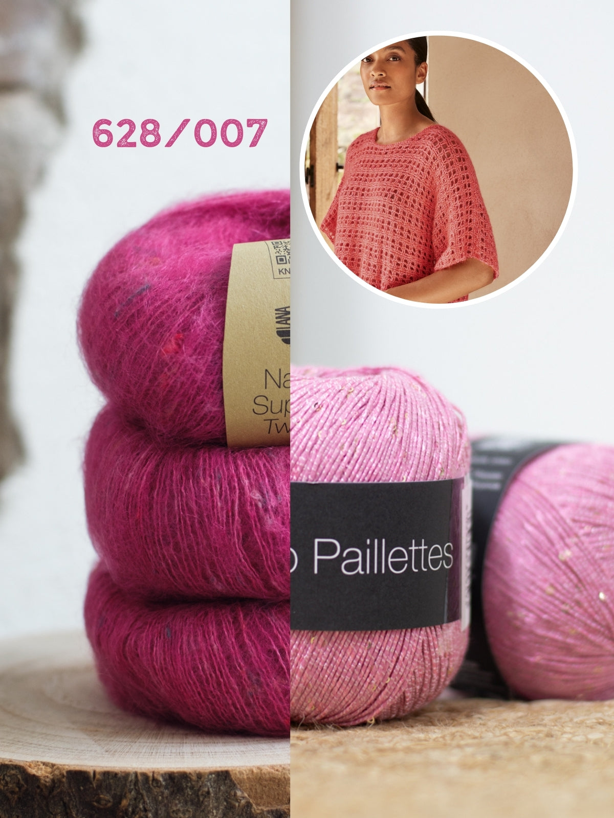 De shirt wordt gebreid met Natural Superkid Tweed (60% superkid mohair, 30% zijde, 7% katoen en 3% polyester) en Filo Paillettes (55% katoen, 39% polyester en 6% polyamide). Het patroon is uitgeschreven in maat 36 t/m 50.