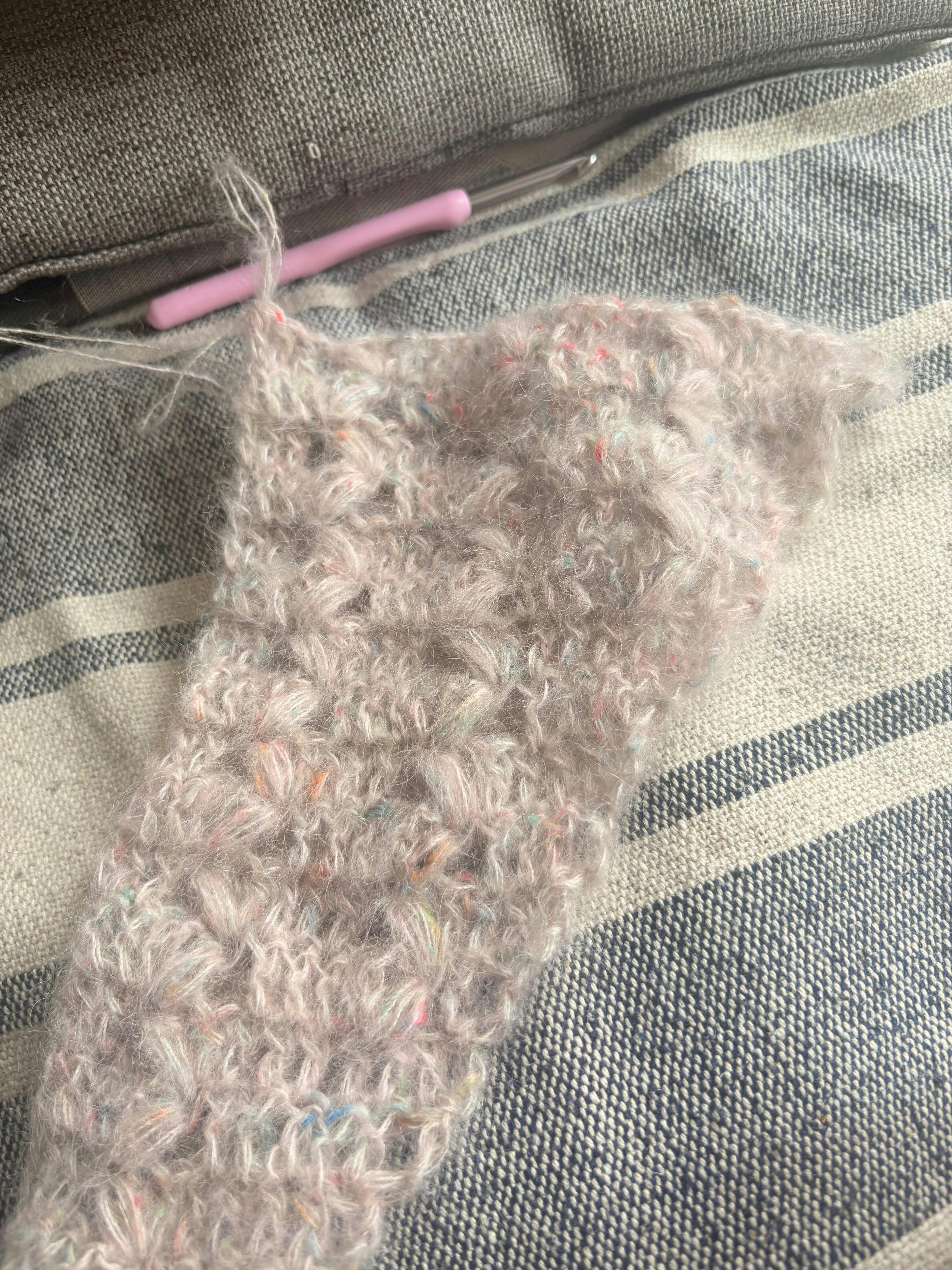 De stola wordt gehaakt met Natural Superkid Tweed, dit garen bestaat uit 70% mohair en 30% zijde. De stola wordt ca. 124 x 190 cm.