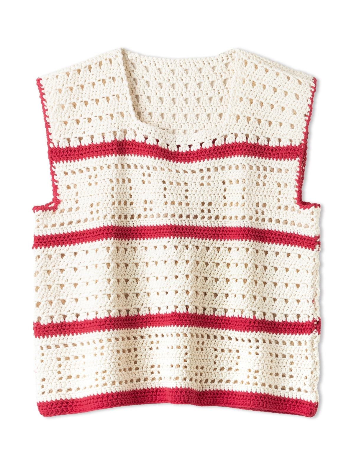Deze gestreepte top wordt gehaakt met een opengewerkt patroon. De top wordt in panden gehaakt welke aan het einde aan elkaar genaaid worden.