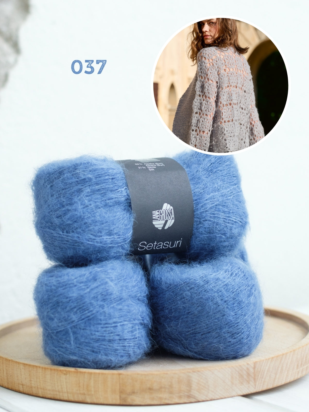 Het pakket bestaat uit 7/11 bollen Setasuri en het Nera nr. 2 magazine van Lana Grossa. De benodigde haaknaald (3mm en 3.5mm) kun je hieronder toevoegen aan je winkelmandje.