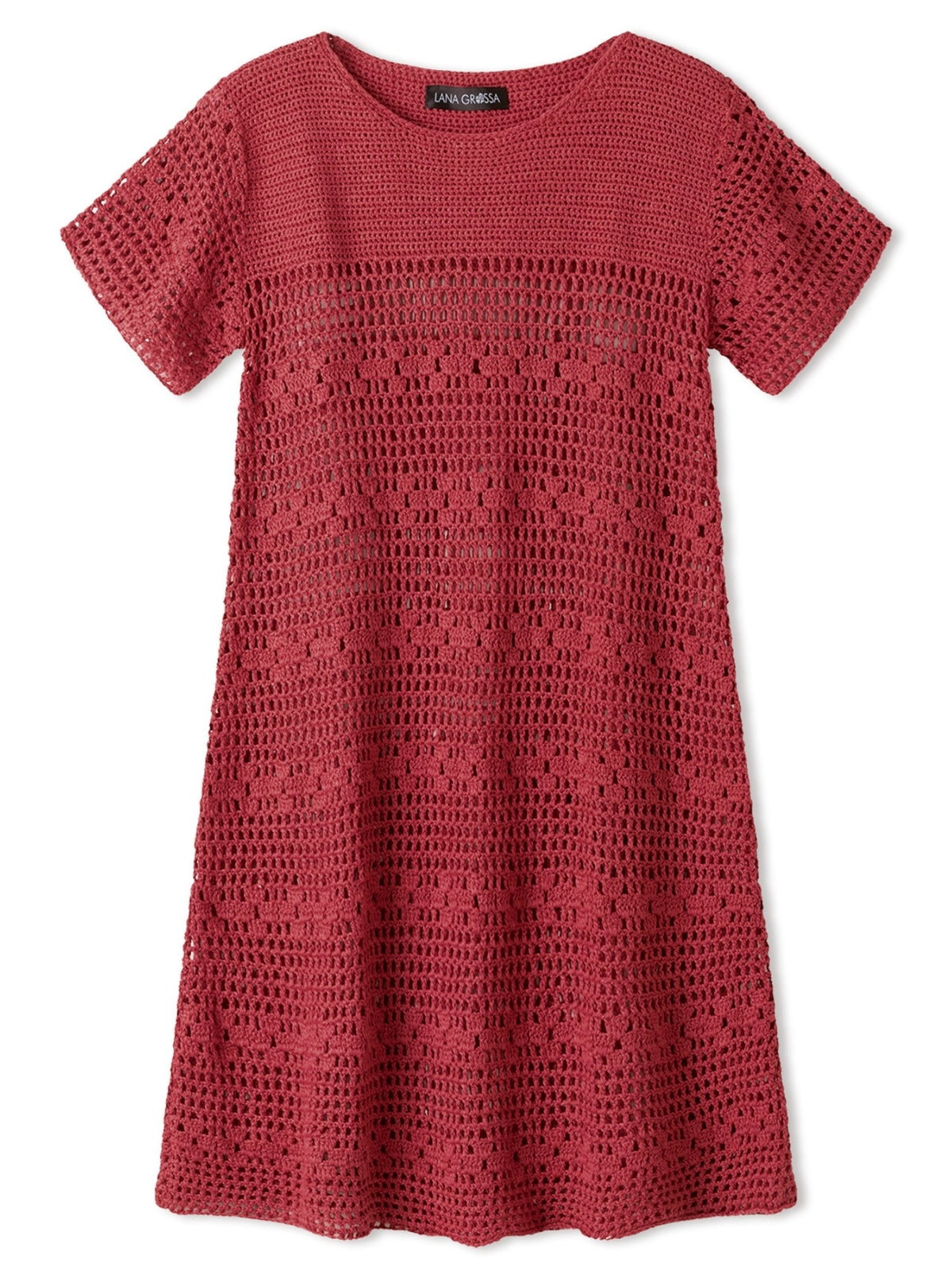 De jurk wordt gehaakt met Summer Cashmere, dit garen bestaat uit 90% katoen, 10% kasjmier. Het patroon is uitgeschreven in maat 36 t/m 50.