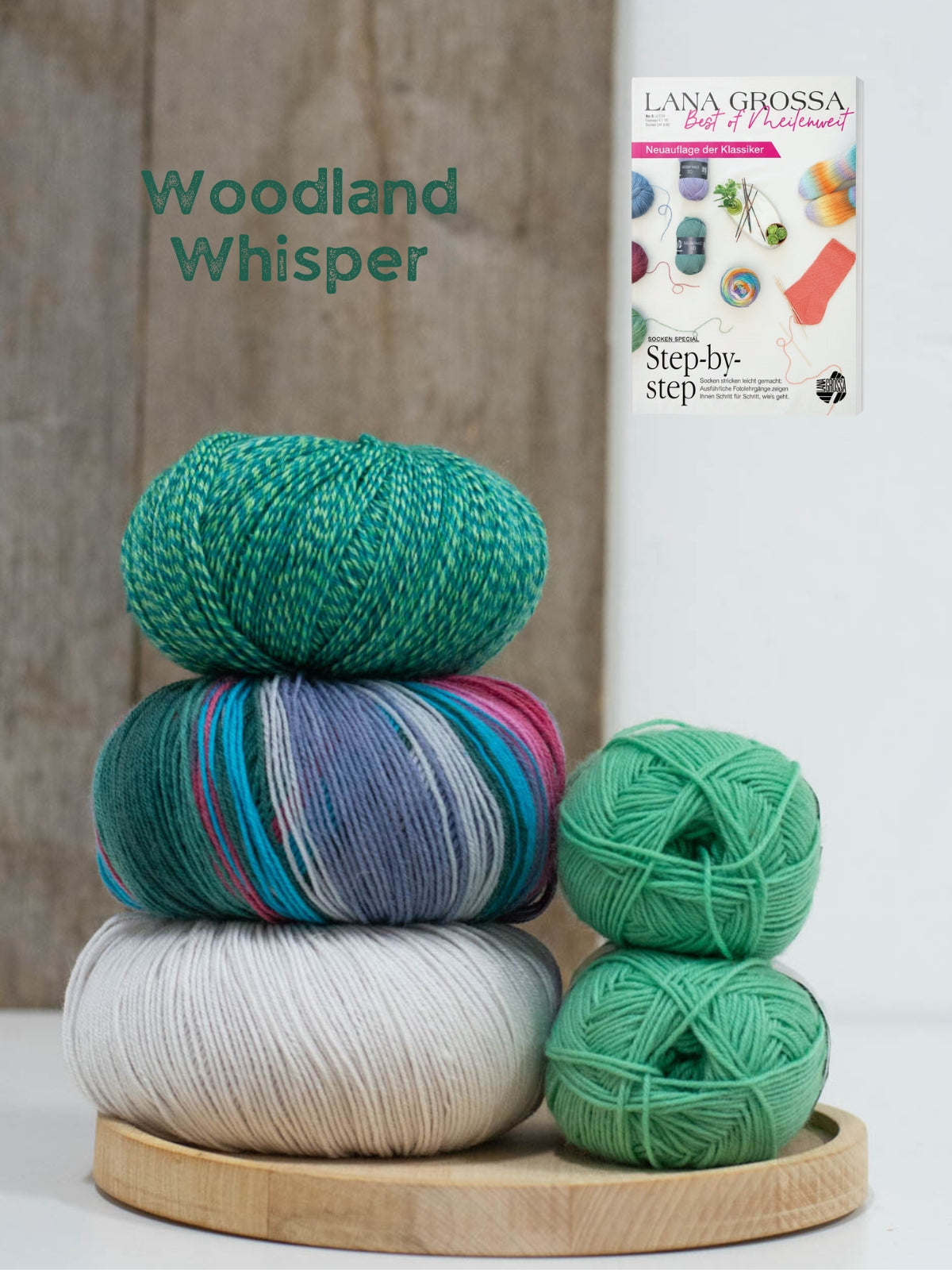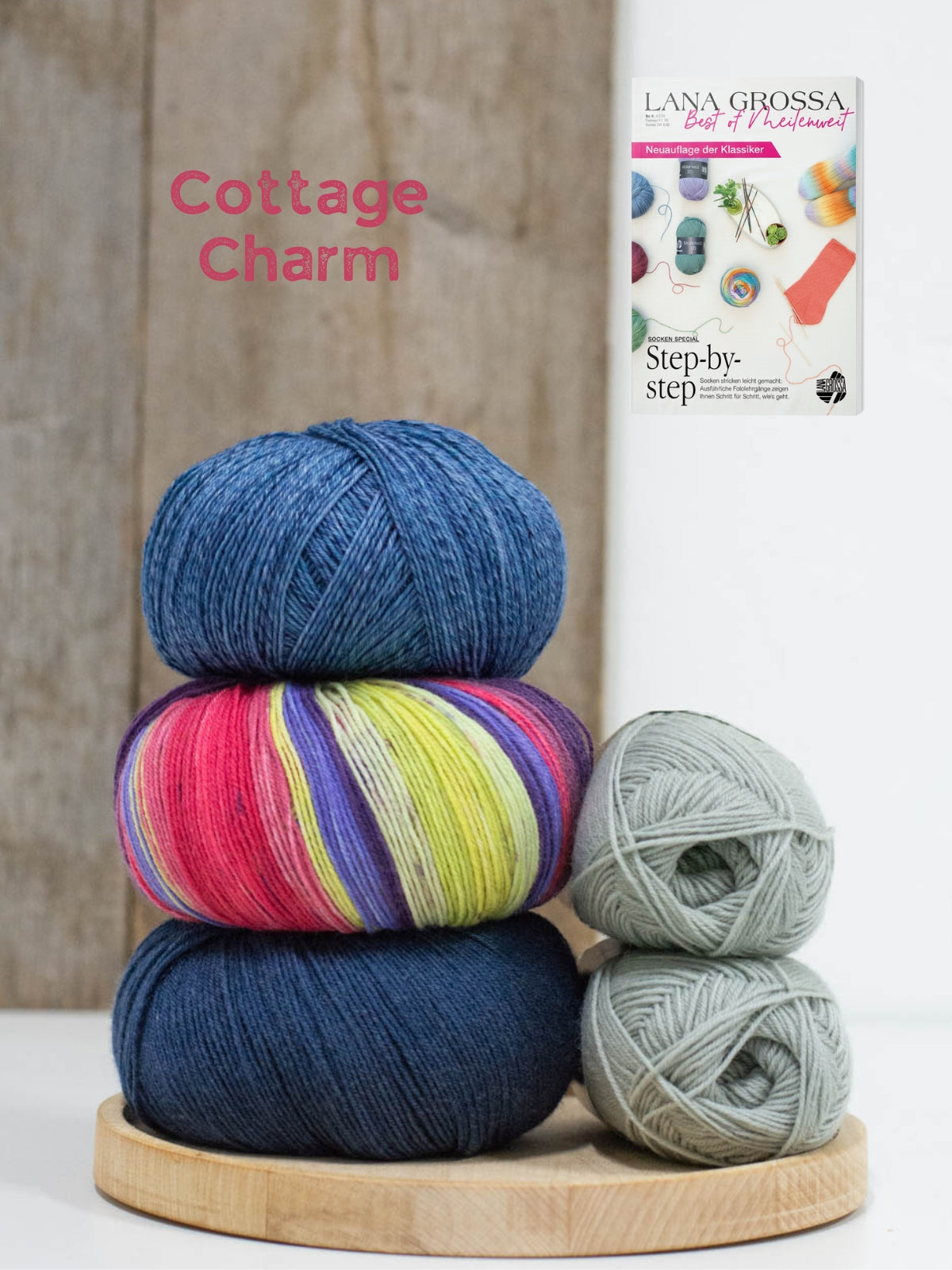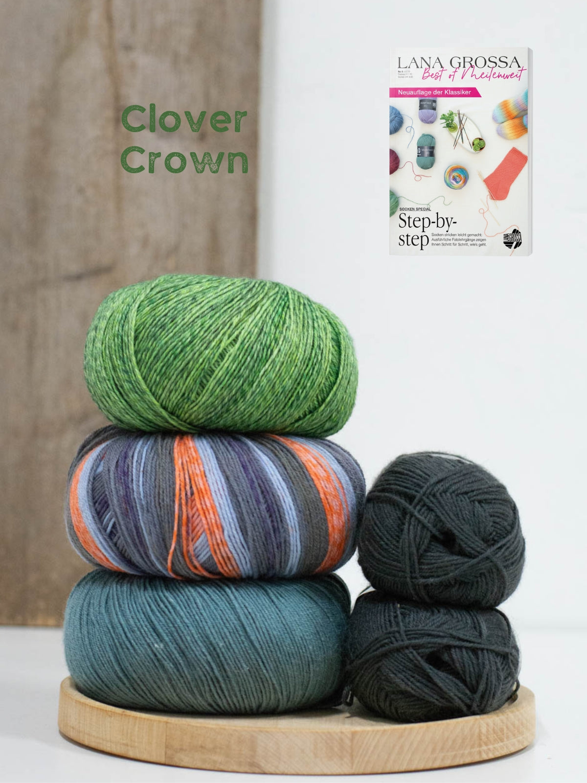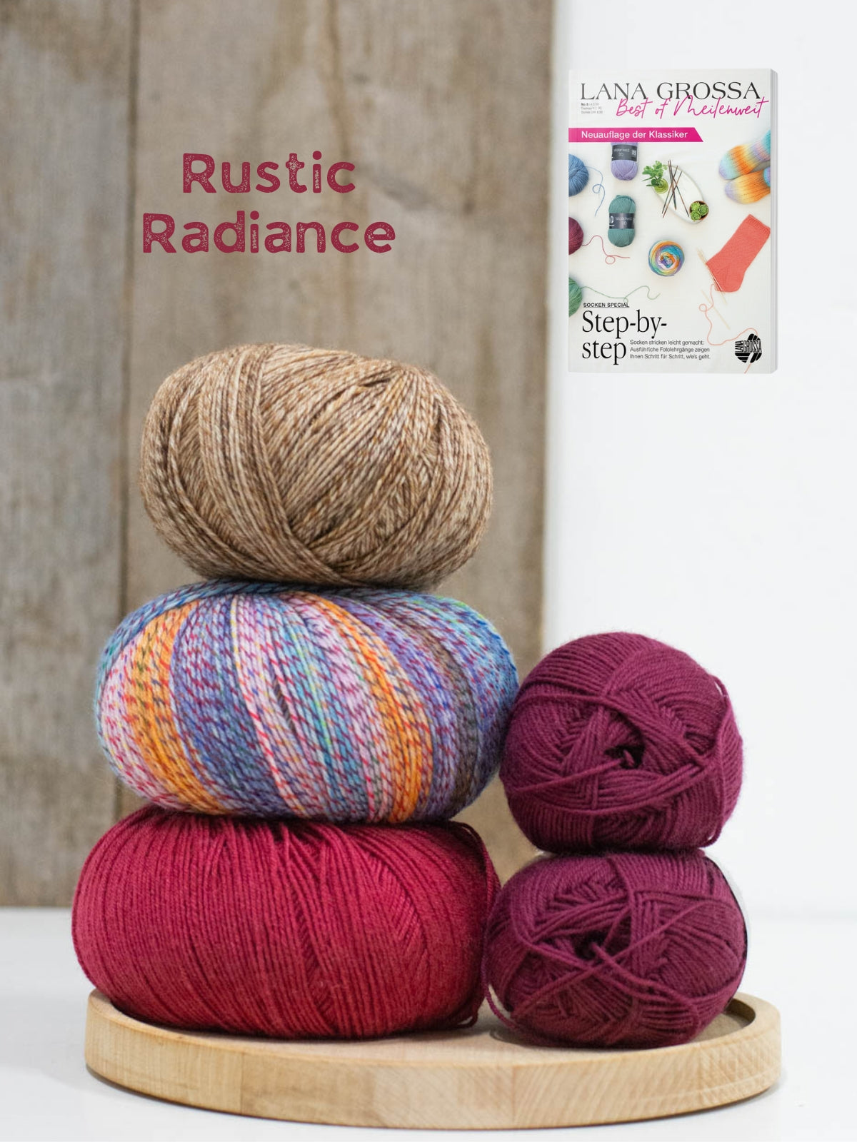 In dit pakket vind je twee bollen Meilenweit 50 Cashmere (70% wol, 25% polyamide en 5% kasjmier), één bol Meilenweit 100 Seta (55% wol, 25% polyamide, 20% zijde), 1 bol Vintage Socks (75% merinowol 25% polyamide) en 1 bol Landlust die Sockenwolle (80% merinowol 20% polyamide). Dit is genoeg om meerdere patronen uit het magazine te maken!