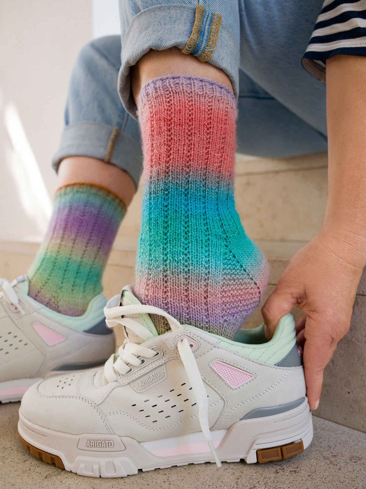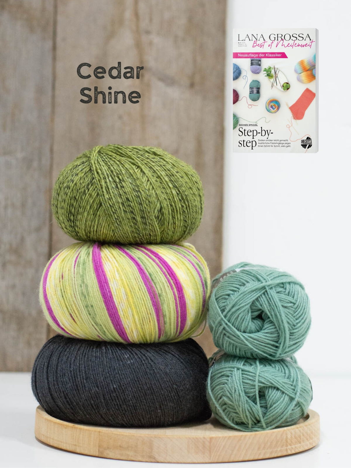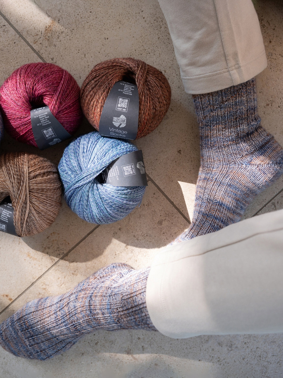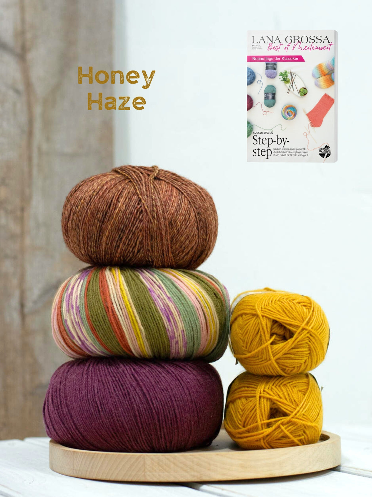 In dit pakket vind je twee bollen Meilenweit 50 Cashmere (70% wol, 25% polyamide en 5% kasjmier), één bol Meilenweit 100 Seta (55% wol, 25% polyamide, 20% zijde), 1 bol Vintage Socks (75% merinowol 25% polyamide) en 1 bol Landlust die Sockenwolle (80% merinowol 20% polyamide). Dit is genoeg om meerdere patronen uit het magazine te maken!